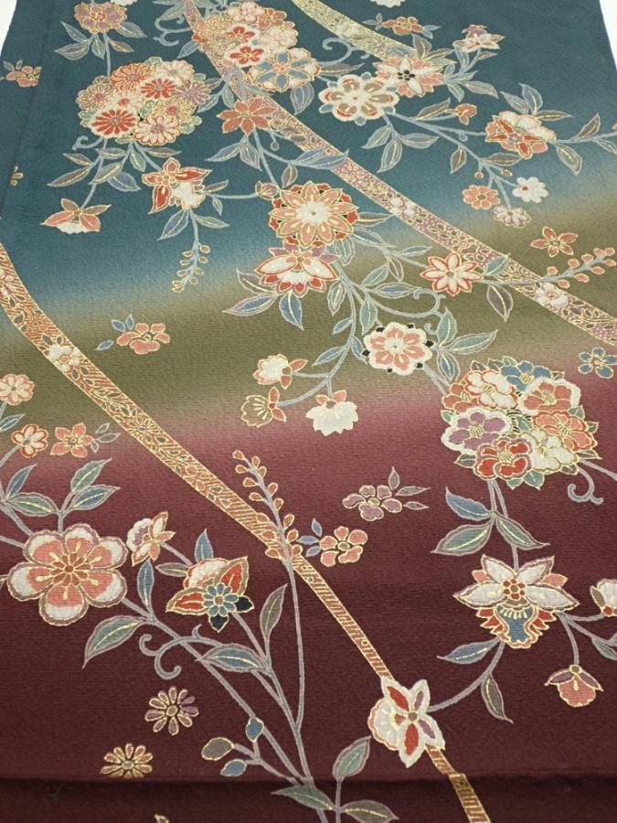 2H01z60 Japanese Kimono Silk FABRIC Flowers Green-Gray 42.9x15.0