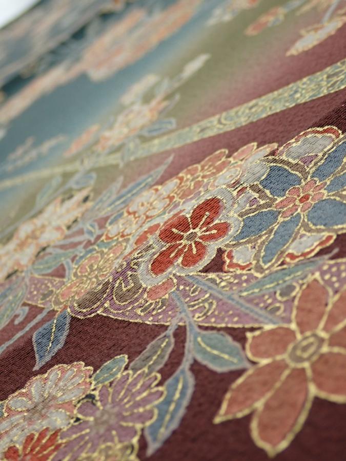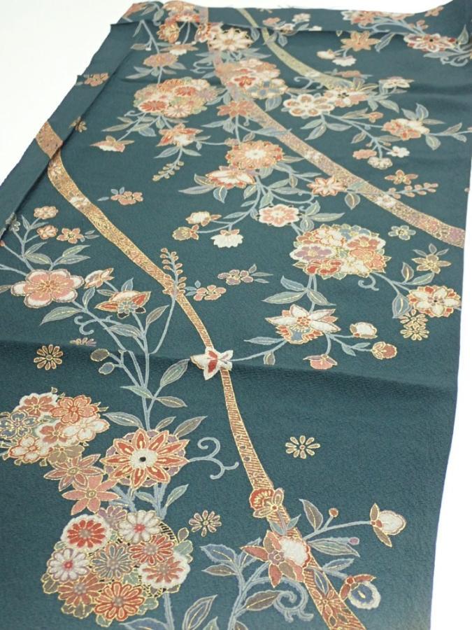 2H02z60 Japanese Kimono Silk FABRIC Flowers Green-Gray 42.5x15.0