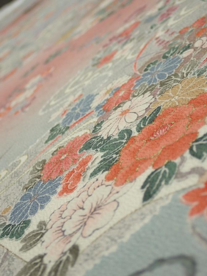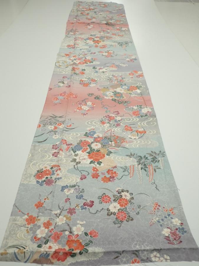 2M06z100 Japanese Kimono Silk FABRIC Flowers Light gray 66.1x15.0