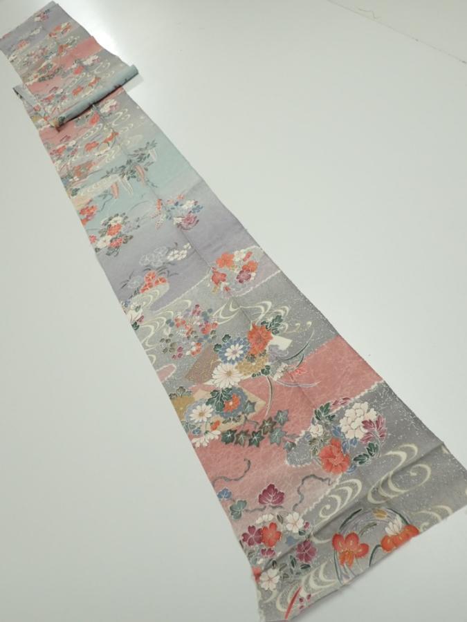 2M09z60 Japanese Kimono Silk FABRIC Flowers Light gray 80.3x7.5