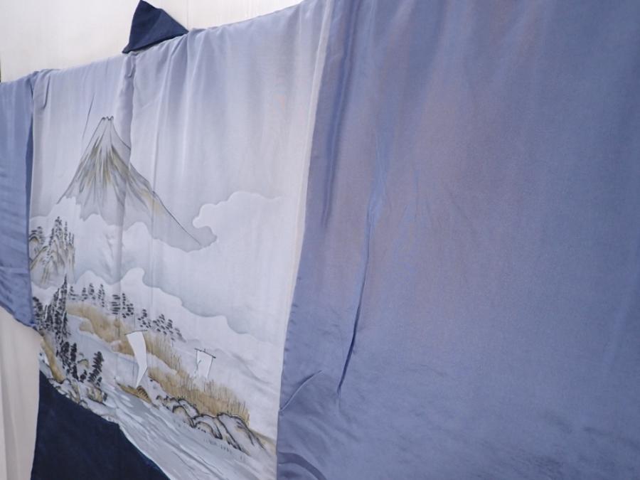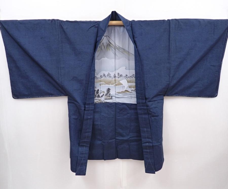 6309T05z670 Vintage Japanese Kimono Silk Men's HAORI Mt.Fuji Navy