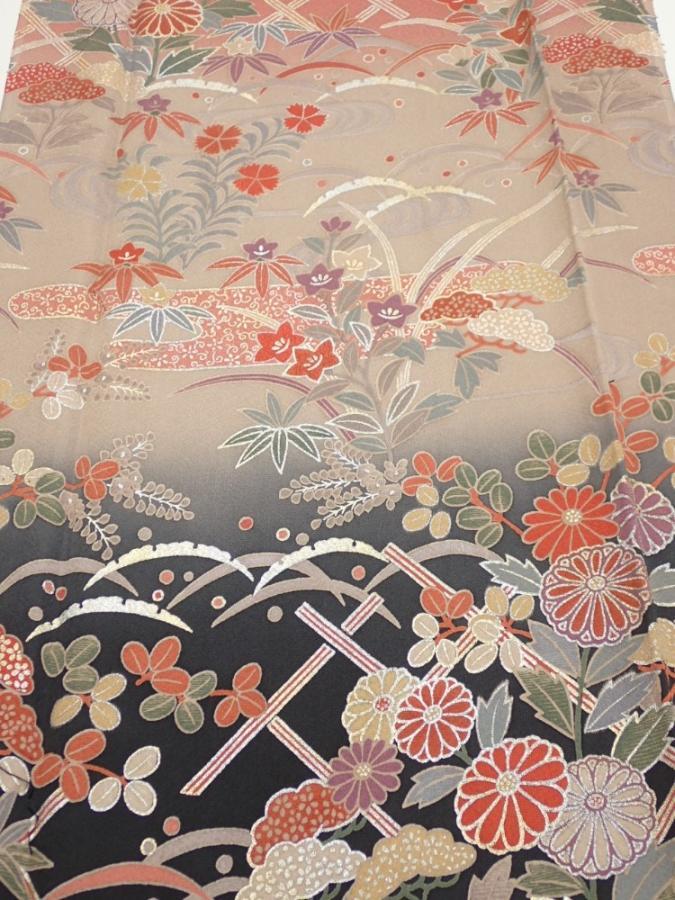 1F04z90 Japanese Kimono Silk FABRIC Flowers Brown-Gray 68.1x14.4