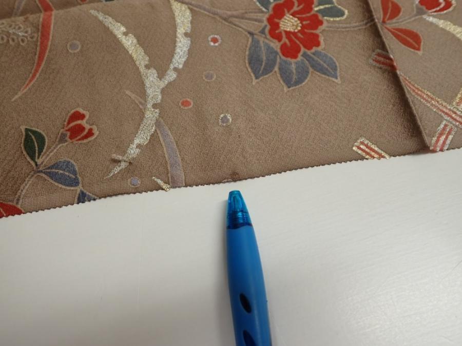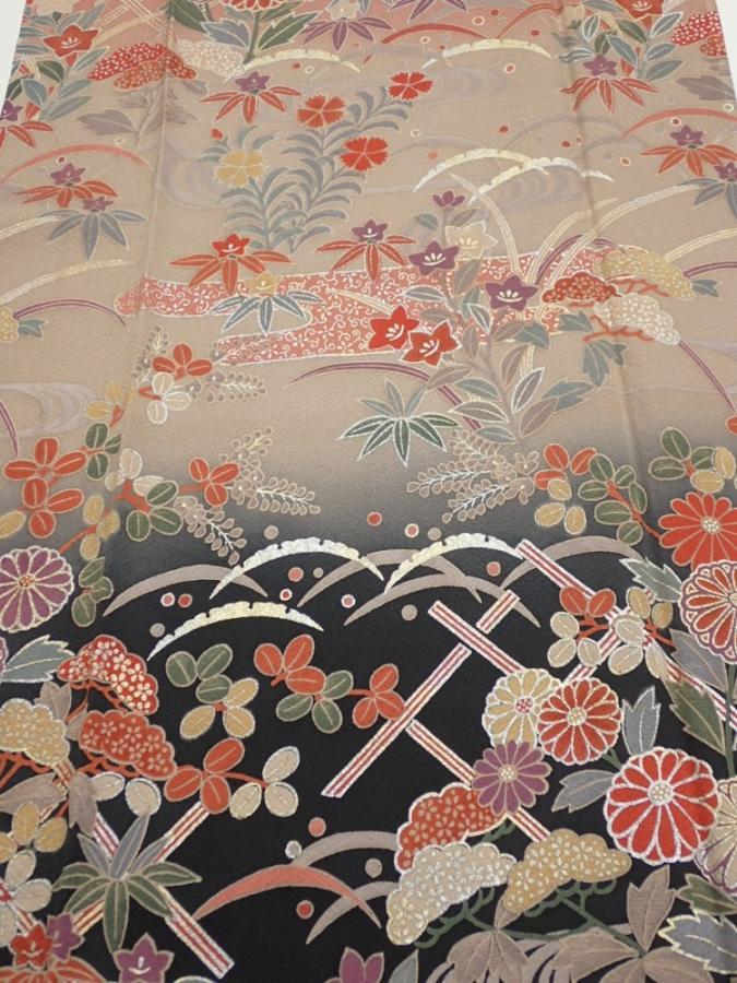 1F05z90 Japanese Kimono Silk FABRIC Flowers Brown-Gray 68.5x14.4