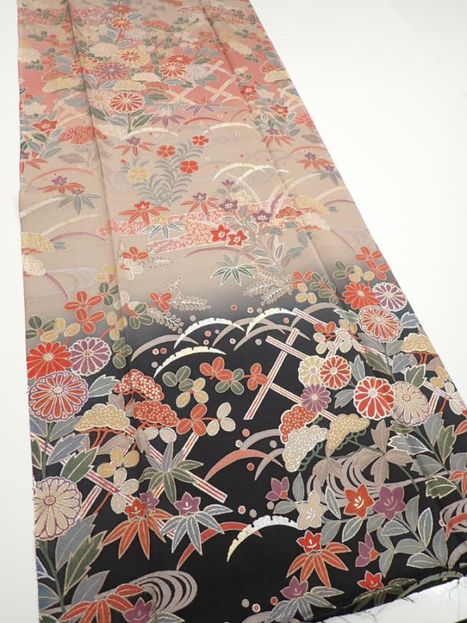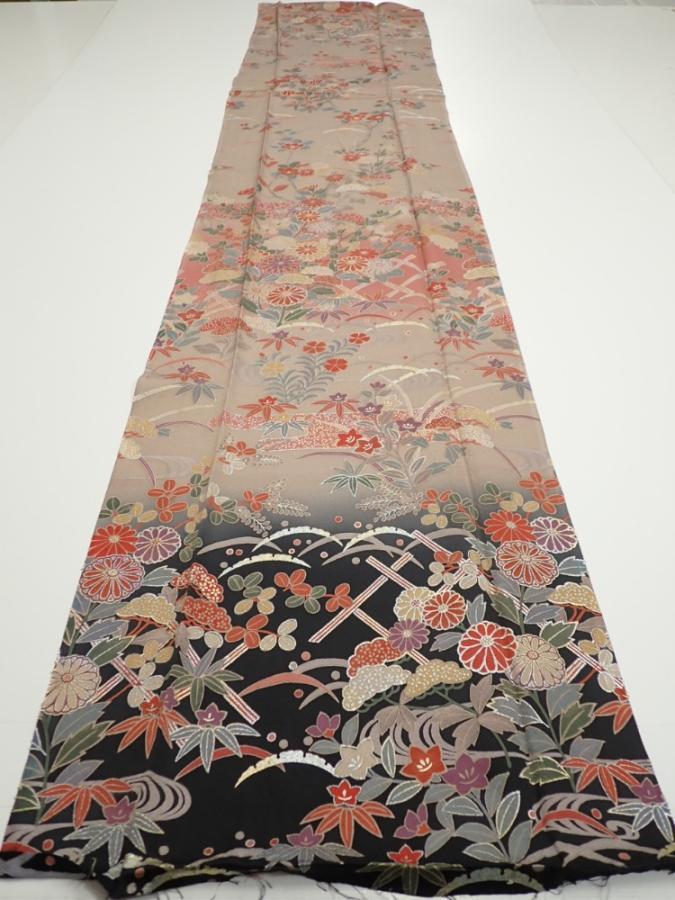 1F06z90 Japanese Kimono Silk FABRIC Flowers Brown-Gray 68.9x14.4