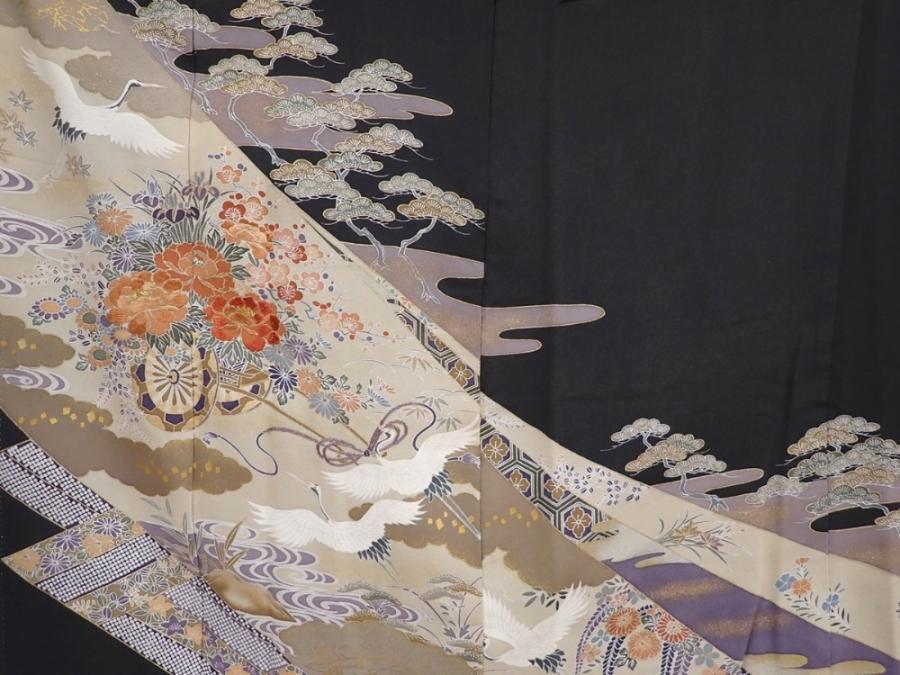 6310T04z1370 Japanese Kimono Silk TOMESODE Flower cart Black
