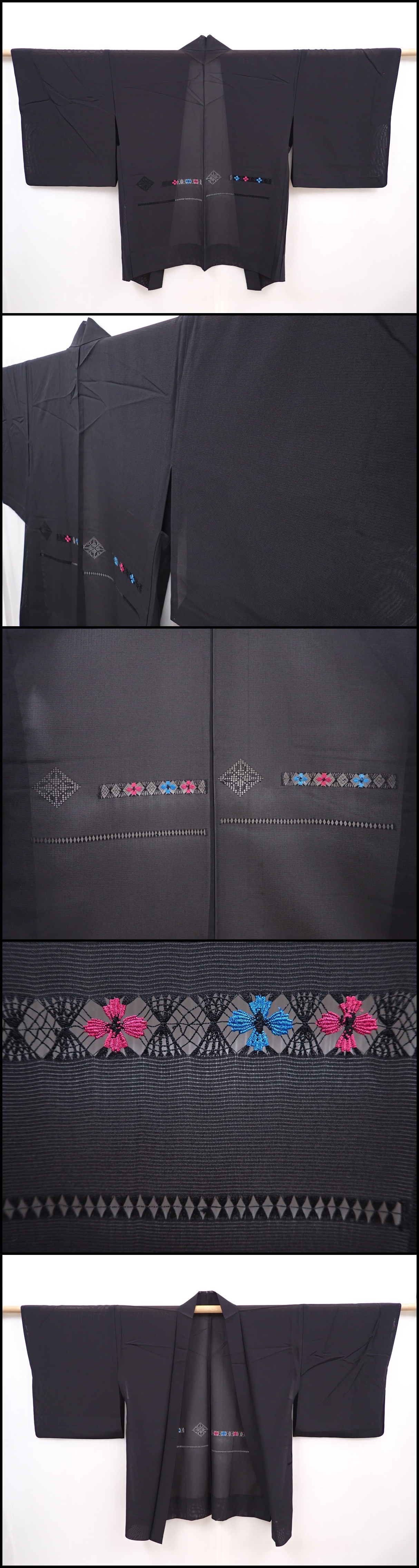 6313T02z240 Vintage Japanese Kimono Silk See through HAORI Flower Black