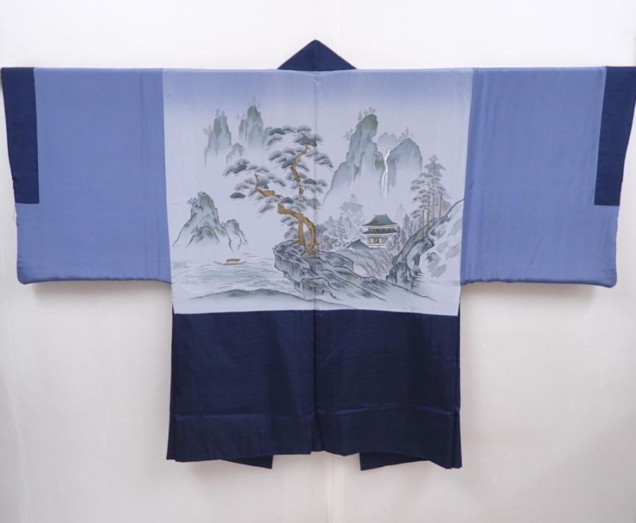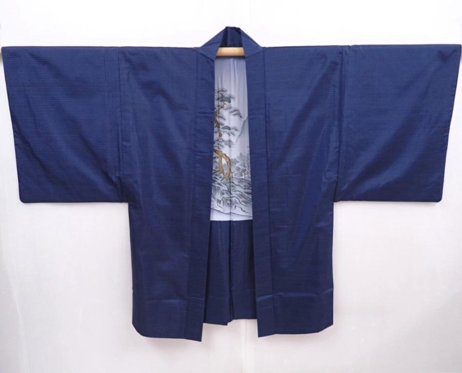 6313T03z480 Vintage Japanese Kimono Silk Men's OSHIMA HAORI Pine Navy