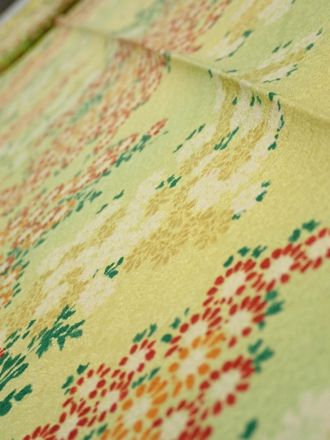 1A09z50 Japanese Kimono Silk FABRIC Flowers Lime-Yellow 75.2x6.9