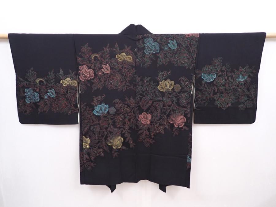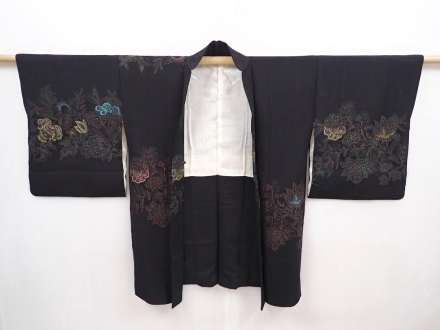 6319T01z520 Vintage Japanese Kimono Silk HAORI Flower Black
