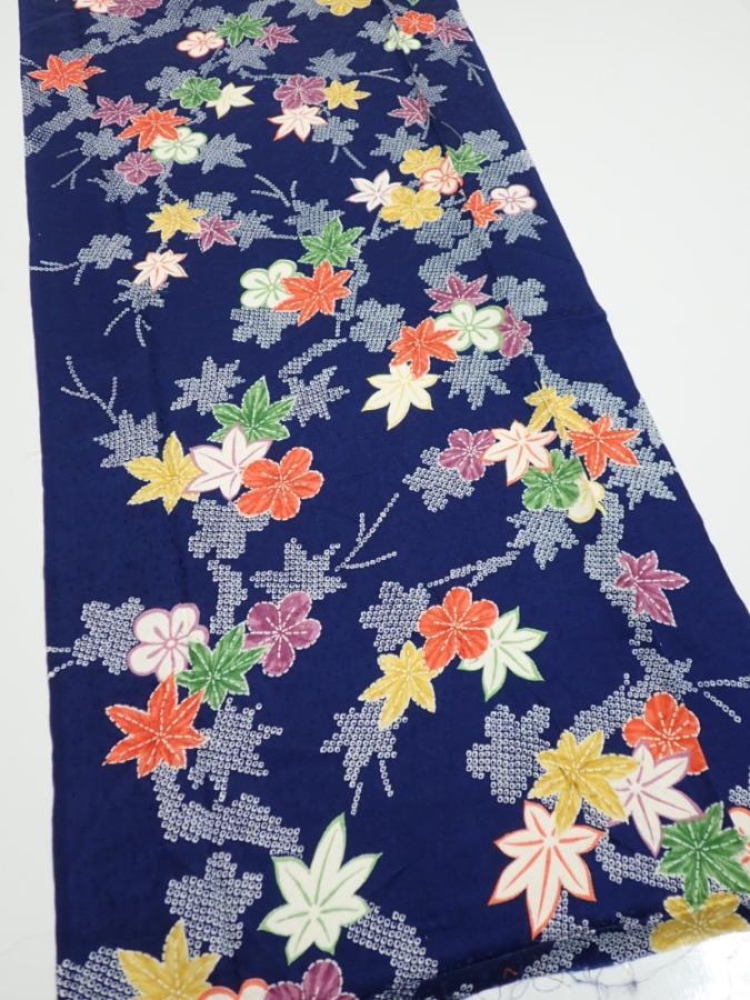1B06z80 Japanese Kimono Silk FABRIC Maple Navy 63.0x14.6