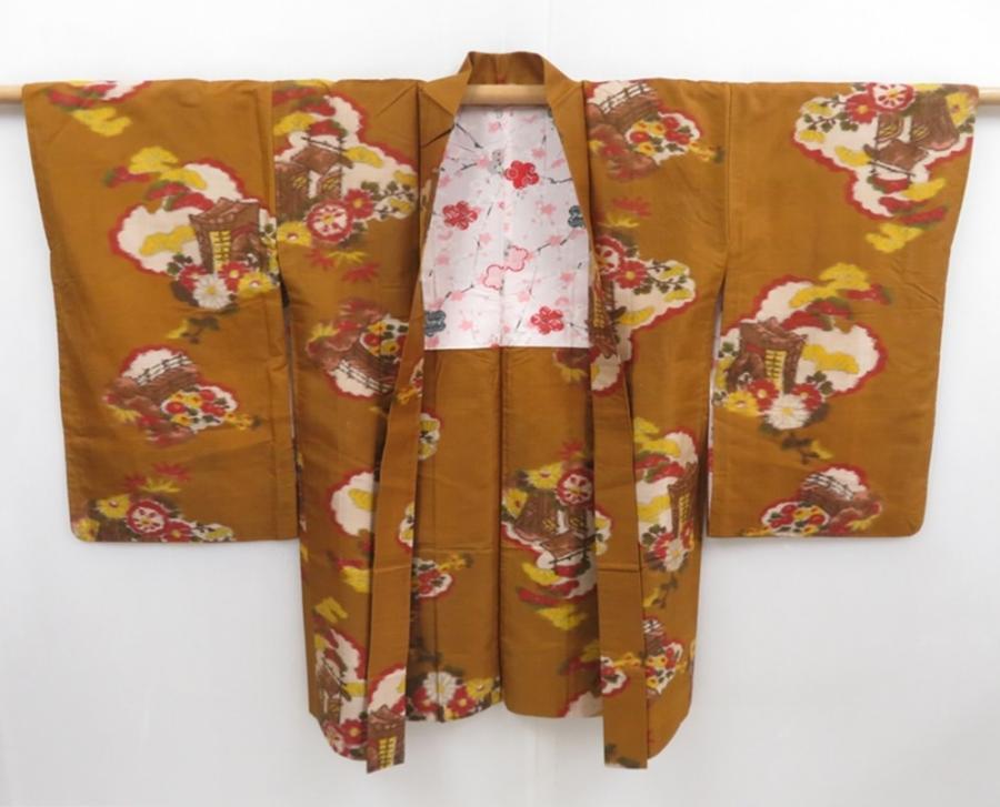 4629T05z460 Vintage Japanese Kimono Silk HAORI Royal cart Yellow ochre